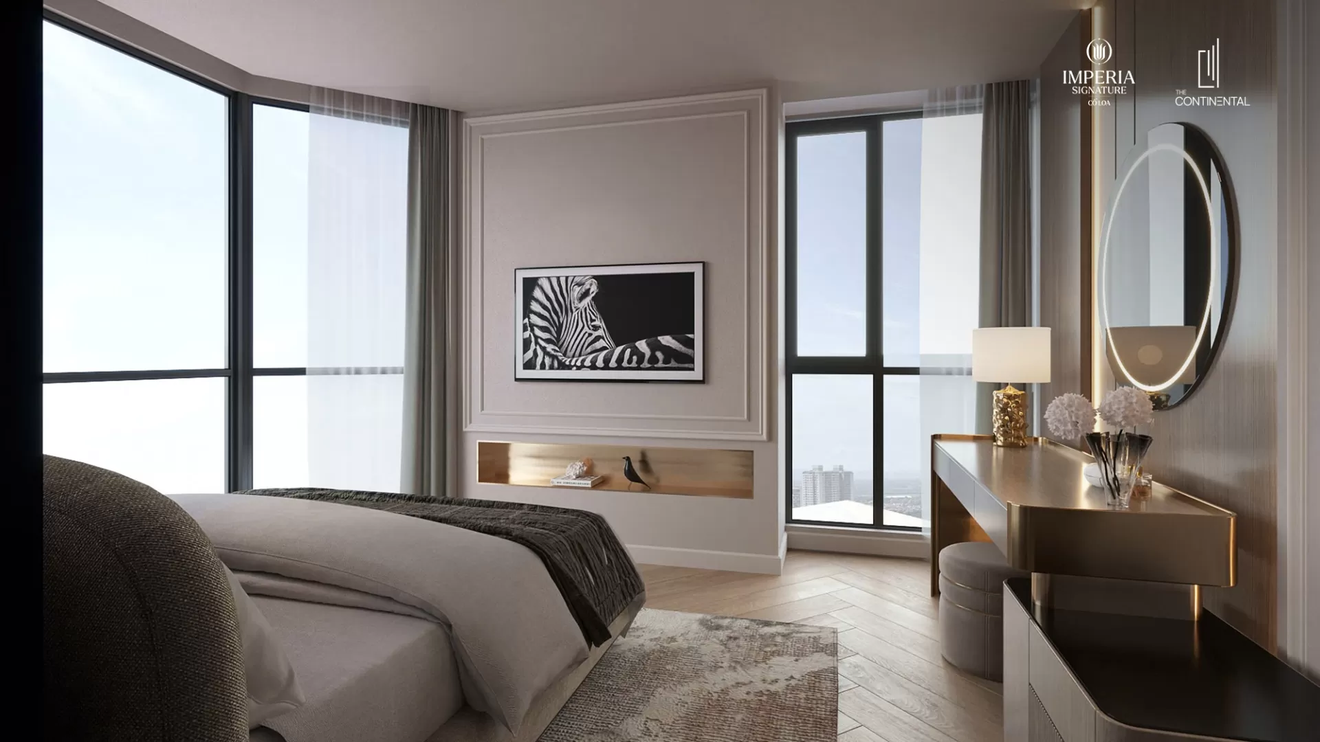 Một điểm nhấn khác trong thiết kế tại The Continental được khách hàng yêu thích là phòng ngủ chính của các căn hộ góc được thiết kế hệ kính tràn góc, mang đến tầm nhìn panorama ngoạn mục. Từ ngay chính phòng ngủ, chủ nhân có thể phóng tầm mắt ra công viên, mặt hồ rộng lớn hay ngắm nhìn khung cảnh lung linh, rực rỡ của thành phố về đêm. Đó cũng là nơi để mỗi cư dân cảm nhận sự thư thái, đẳng cấp như đang sống giữa một phòng khách sạn 5 sao với tầm view triệu đô.
