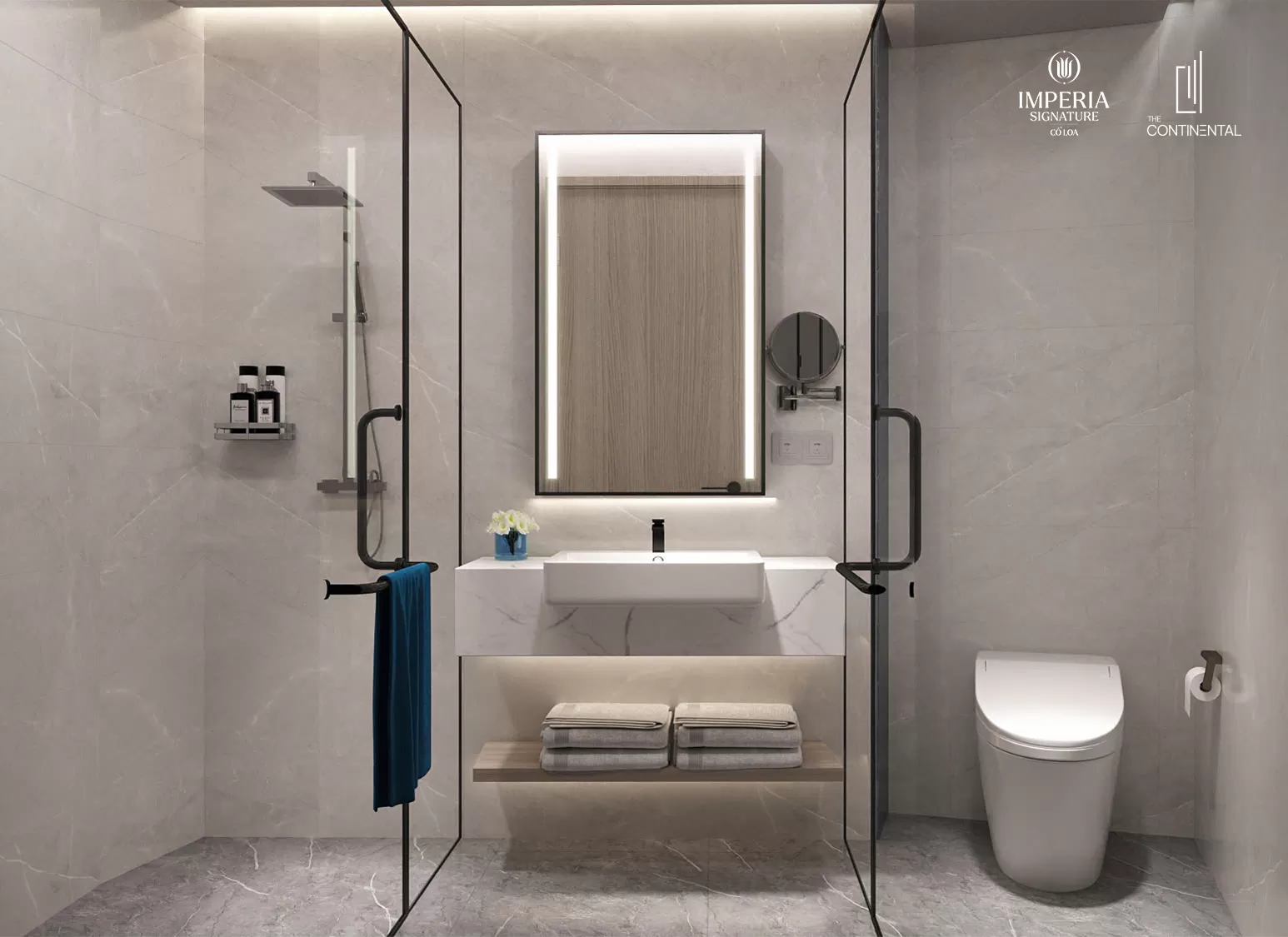 Vượt qua khái niệm một không gian phục vụ nhu cầu cá nhân, phòng tắm trong các căn hộ The Continental sẽ trở thành nơi mỗi cư dân được tận hưởng cảm giác thư giãn sau những bộn bề cuộc sống. Với thiết kế tinh tế, chia thành 3 khu vực chức năng riêng biệt, phòng tắm mang đậm dấu ấn của những khách sạn quốc tế danh tiếng, đảm bảo sự tiện nghi, riêng tư và thoải mái tuyệt đối.