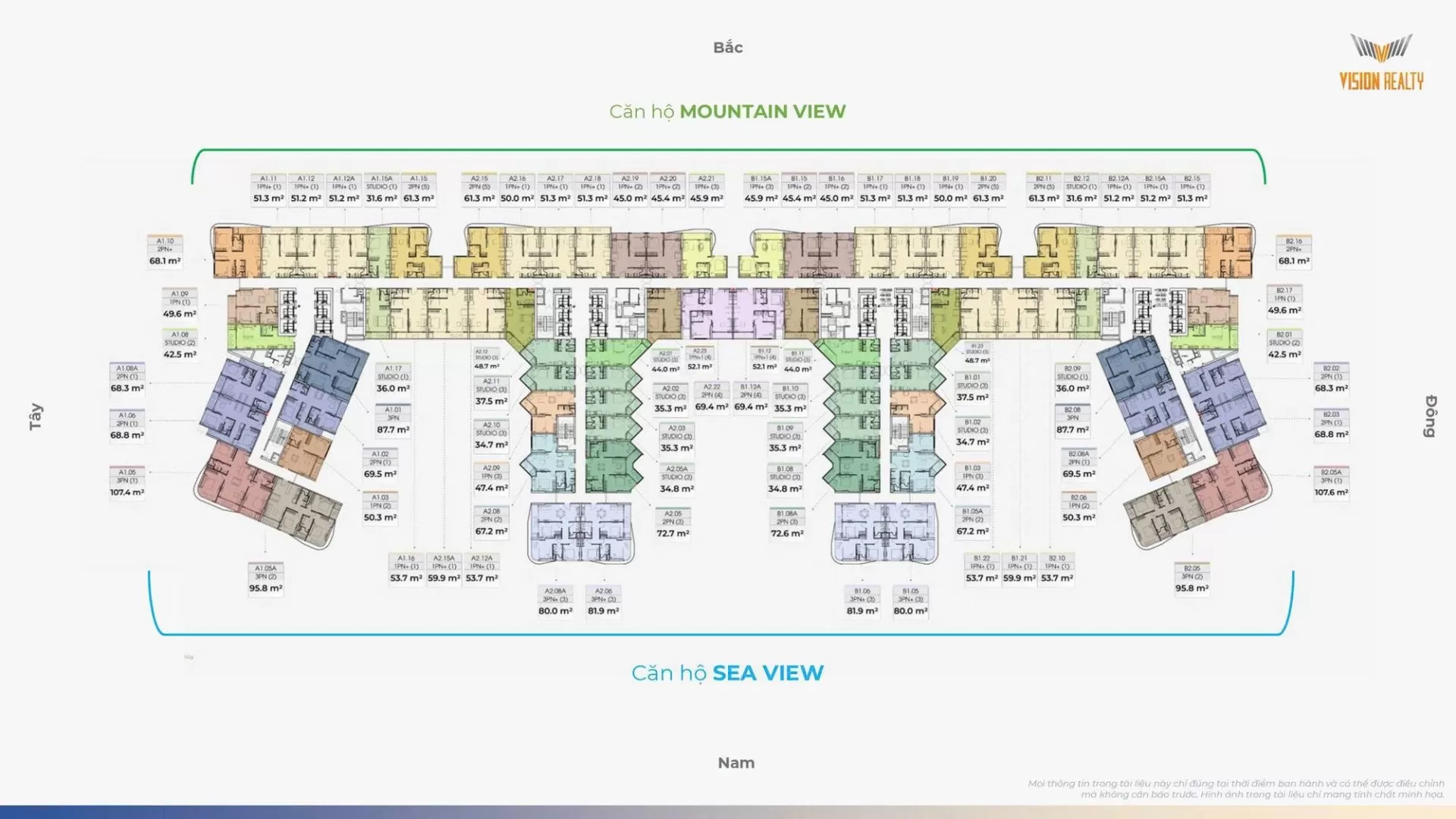 Các căn hộ 1 phòng ngủ và 1 phòng ngủ cộng (1PN+) sở hữu diện tích linh hoạt từ 42 m2 đến hơn 95 m2. Không gian cộng thêm có thể được tùy biến linh hoạt thành phòng làm việc hoặc phòng ngủ nhỏ cho trẻ em, đáp ứng nhu cầu của các cặp vợ chồng trẻ hoặc gia đình ít người. Dòng căn hộ 2 phòng ngủ (73,8 – 114 m2) và 3 phòng ngủ (81 – 107 m2) hướng tới đối tượng khách hàng mong muốn không gian sống rộng rãi để nghỉ dưỡng cuối tuần hoặc an cư lâu dài cùng gia đình đa thế hệ. Sự thông thoáng và khả năng đón gió tự nhiên được ưu tiên hàng đầu trong các thiết kế căn hộ có diện tích lớn.